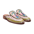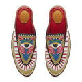 A dynamic statement with a dash of whimsy, the peeper mules have been decorated with rich graphic motifs set against an amusing color palette. The delicate florets mingle with the omnipotent eye motif radiating an exquisite statement.